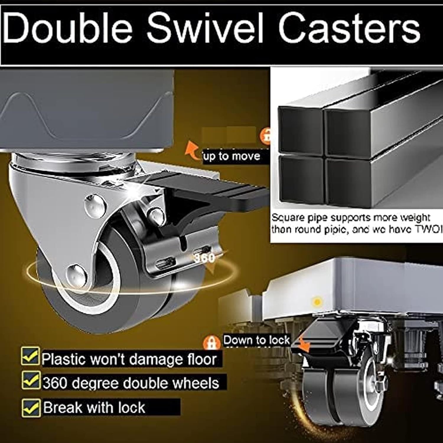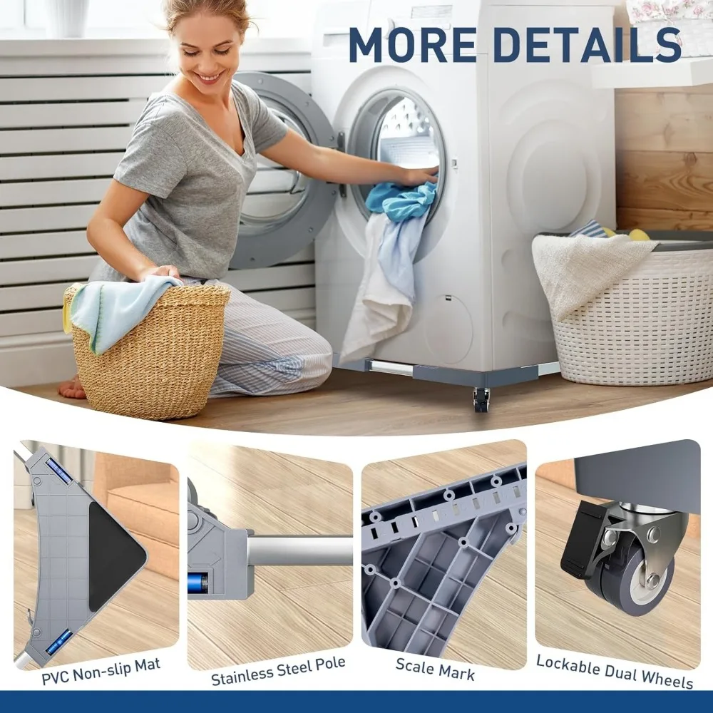 The dolly for washing machine has four DOUBLE swivel casters with locks. The wheels will make the moving easier if you want to clean the area. After cleaning, you can roll the appliance back and then lock the wheels. The lock will secure the wheel so the washer/dryer won't shake in use.